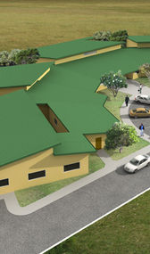 Construction de l'agence Enercal de Koné, avec ateliers techniques destinés à l'entretien du réseau électrique et bureaux d'accueil clients. Parkings et espaces végétalisés.